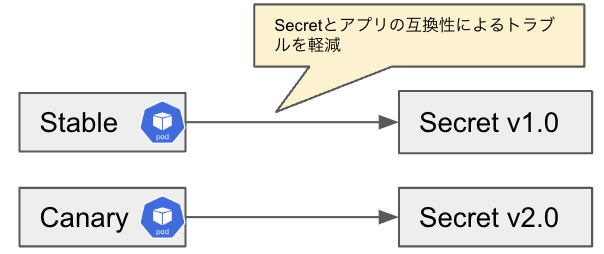 また、古いSecretについてはStable版のPodが参照するため消さないようにしています。 古くて不要なSecretリソースが残ってしまうデメリットはありますが、動作中のPodと新たに作成するカナリア版Podが参照するリソースを分け、Secret変更による影響範囲を新しいPodのみに限定しました。